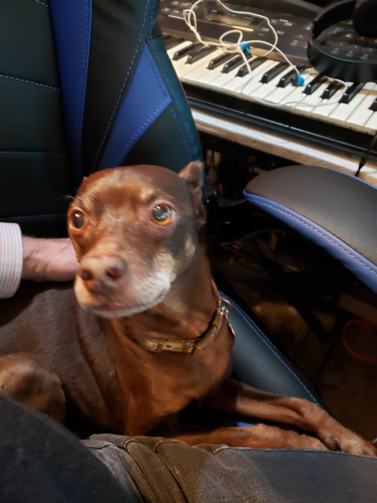 But then, here in my chair in my office, my little buddy Rocket scooches me aside and takes up residence. Pet the dog, man, pet the dog.